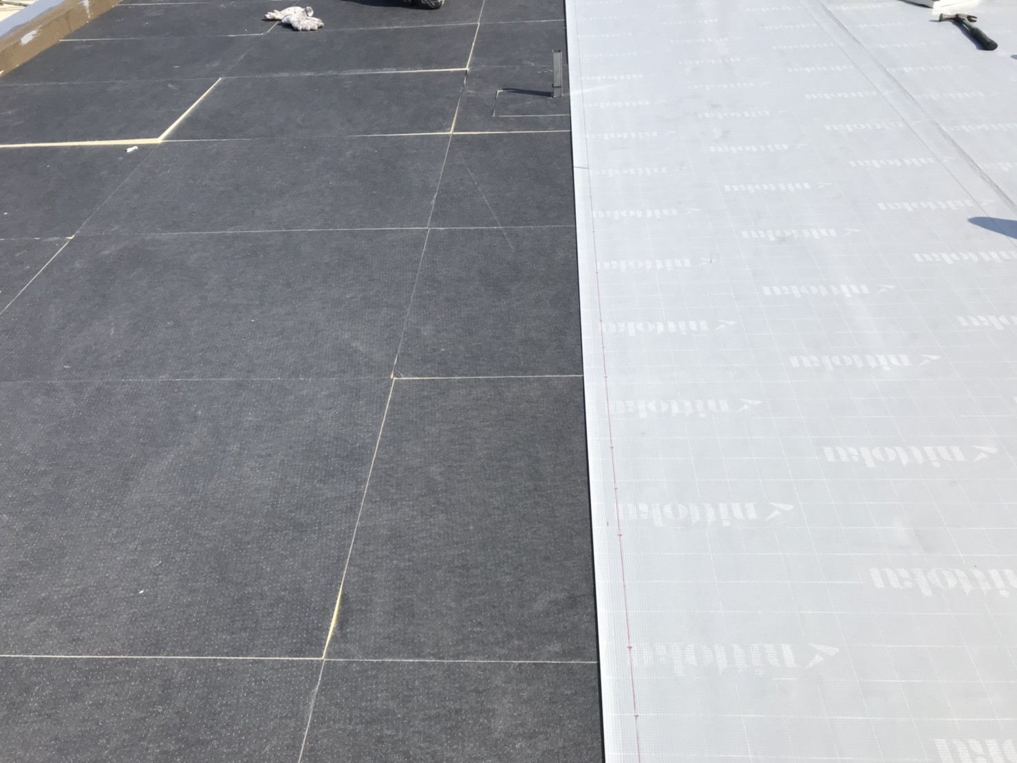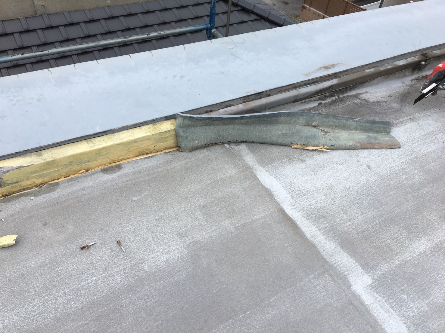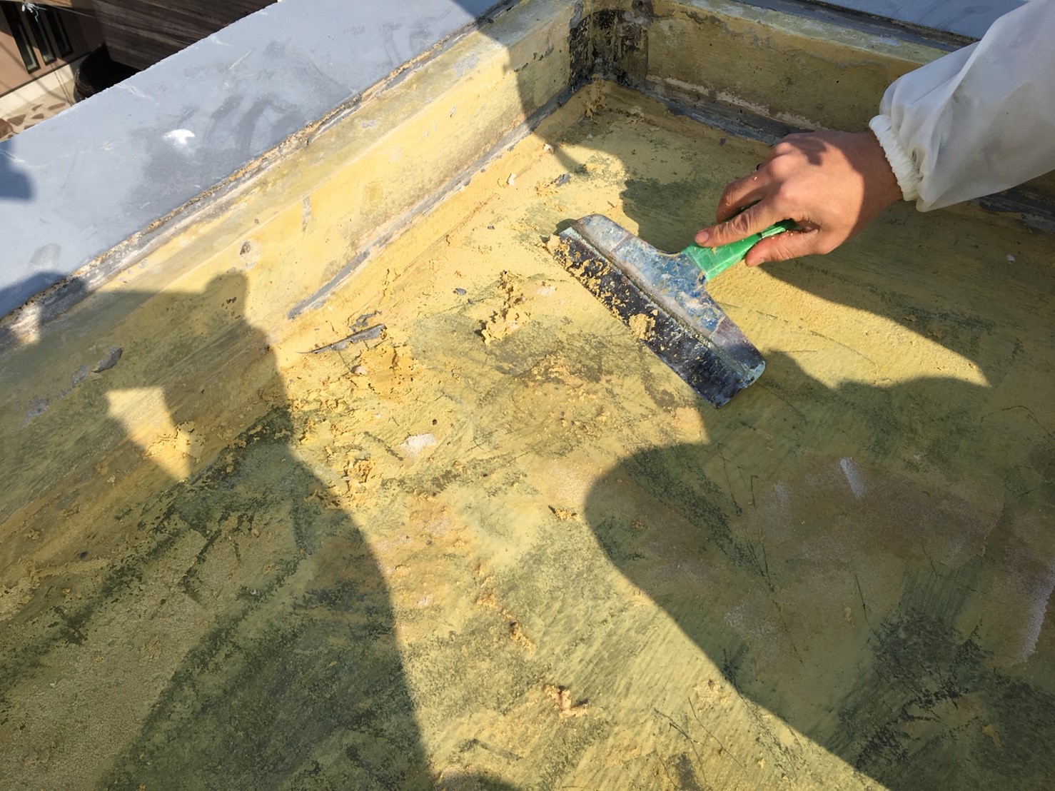 当初の予定では、浮部のみ撤去して既存防水を生かした機械固定式での工法でしたが、工事決定後に浮部を撤去を行ったところ想像をはるかに超える水が溜まっており、やむなく仕様変更を申し出て、既存塗膜全撤去後に新規断熱材を敷く機械的固定・断熱・遮熱工法へ切り替えました。