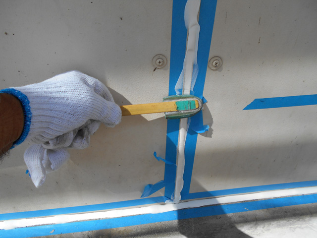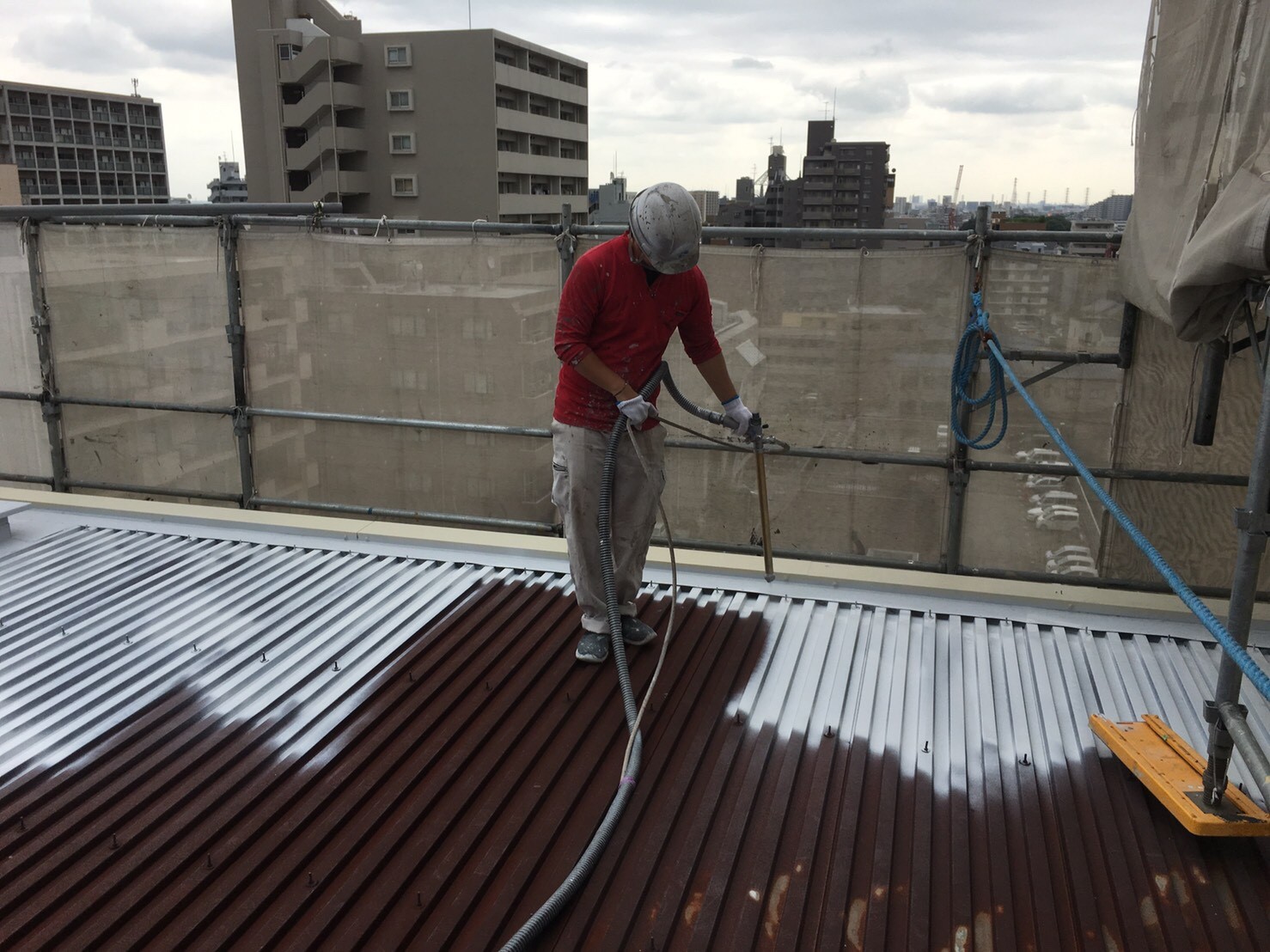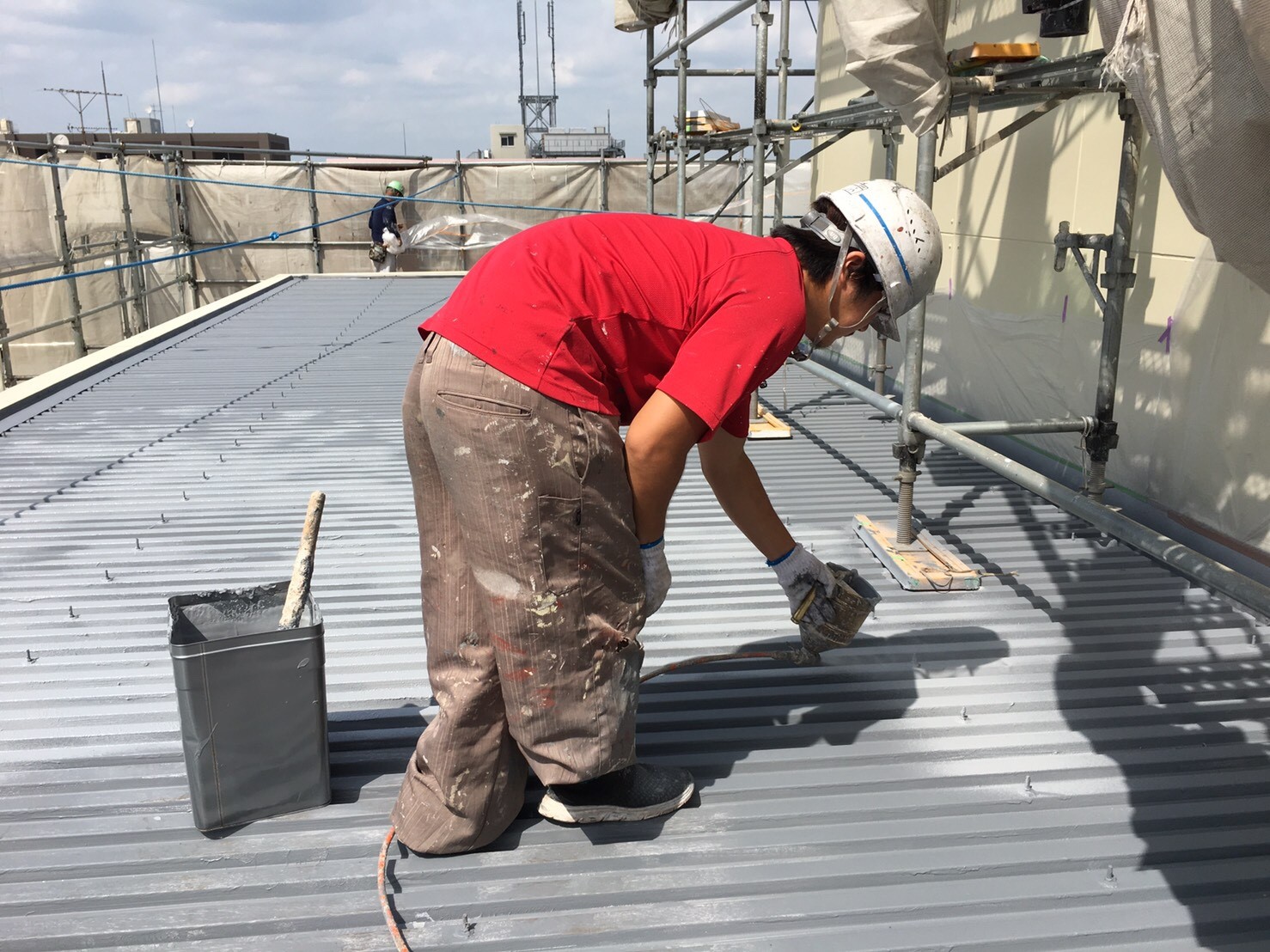 | こだわり | 鋼板屋根の傷みが激しかったため、三菱ケミカルから出ているMYルーファーという製品を使用しました。 この製品は、鋼板屋根にも使用できる水性タイプの数少ない防水材です。 ただ、塗膜の厚みを確保するにはローラーや刷毛では塗装することができなかったため、急遽コンプレッサーで吹き付け塗装でたっぷりと厚みをつけて塗装を行いました。 また、近年のゲリラ豪雨はすざまじい雨量であるため、元来の排水計算の基準から少し変わっていたようで、雨漏りの原因となっていた谷雨樋と排水受けも新しく補修・新設を行い雨漏り防止に努めました。 これで、問題は解消されたと思います。 あってはならないことですが、もしまた不具合が発生しましたらきちんと対応させて頂きますのでご連絡いただければ幸いでございます。 ありがとうございました。 |