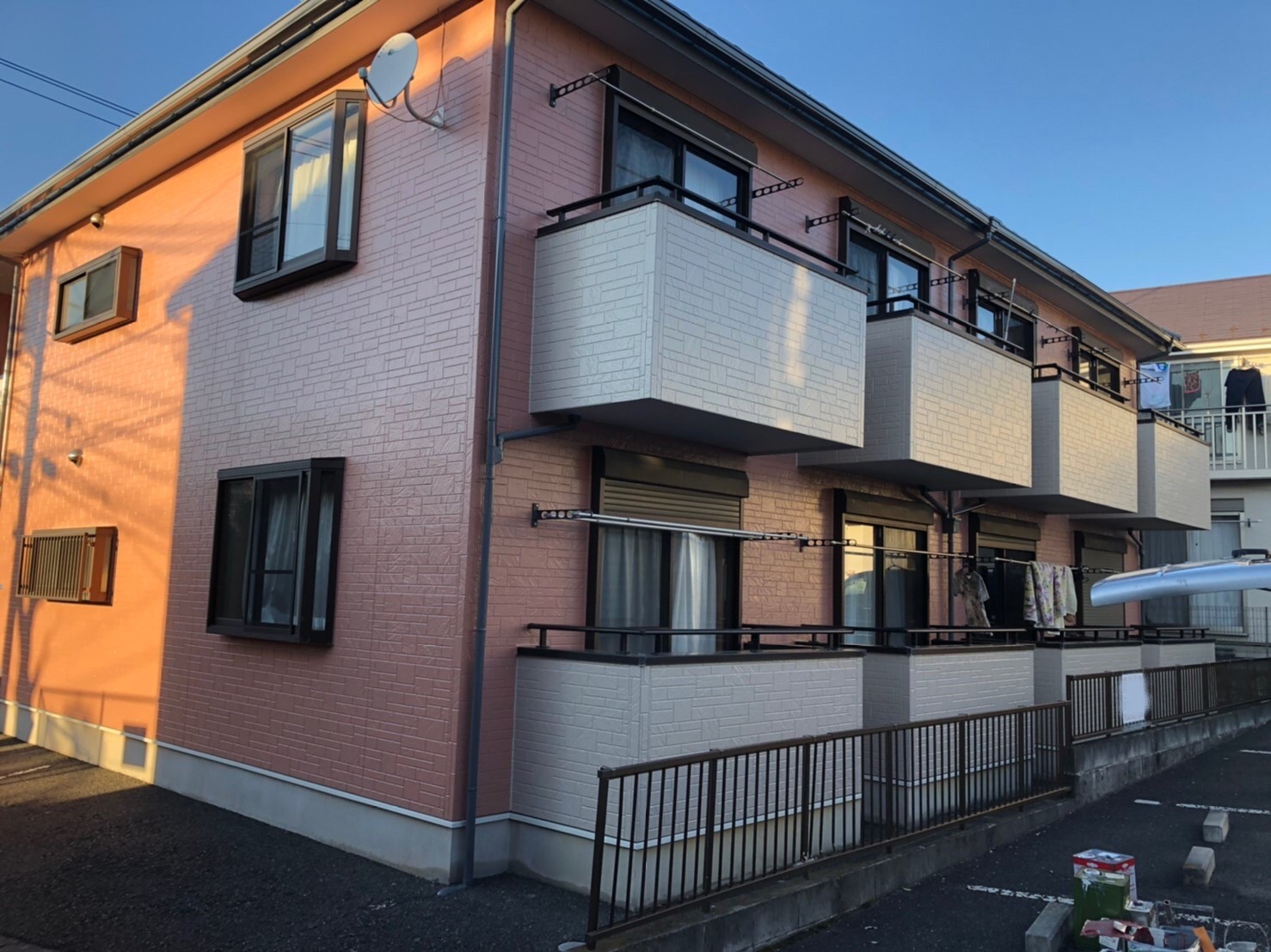 | 塗料 | 外壁:パーフェクトトップ 鉄部:さび落とし+ハイポンファインプライマーⅡ+ファインパーフェクトトップ2回塗り 共用廊下:下地処理+カチオンシーラー+水性防水材アトレーヌ+GRトップ |